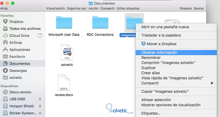 Lo siguiente que debemos hacer una vez se ha descargado, es abrir en el Finder una nueva ventana, para poder seleccionar cual es la carpeta a la que queremos cambiar el icono y pulsamos el botón derecho del ratón. A continuación seleccionamos “Obtener información”.