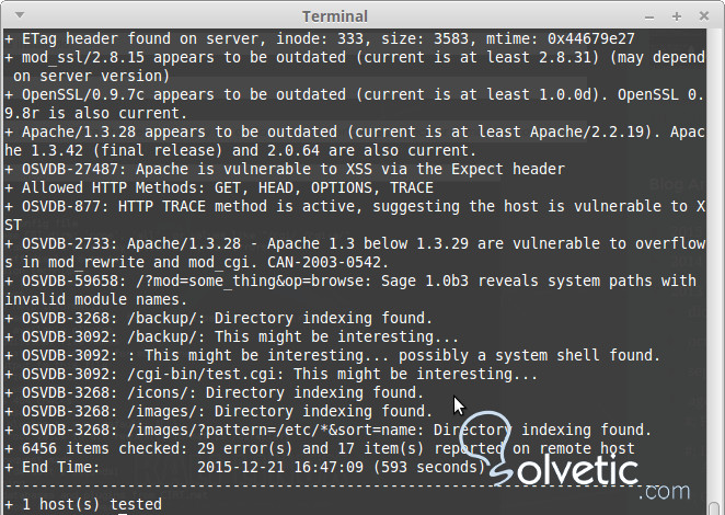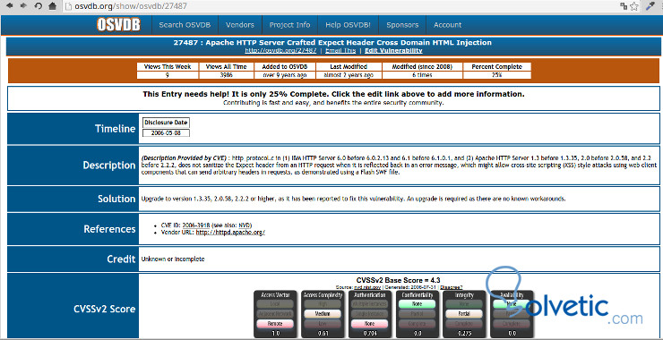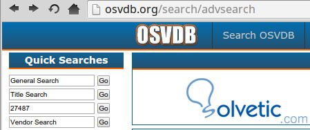 Mientras se realiza el escaneo nos mostrará información de vulnerabilidades que luego podemos buscar por su código en la pagina de Open Source Vulnerability Database (OSVDB) y ver de que se trata la vulnerabilidad y como solucionarla, por ejemplo, tenemos el código OSVDB-27487, vamos a la pagina de búsqueda e ingresamos el código numérico y hacemos clic en GO.