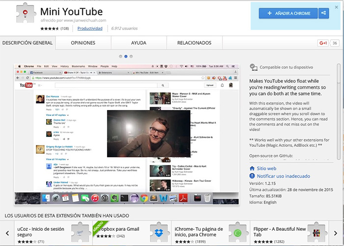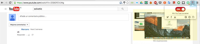 Si queremos poder continuar viendo el video en una pequeña ventana flotante para poder acceder a sus comentarios o realizar nosotros alguno propio sin la necesidad de detener la reproducción, podemos realizarlo gracias a la extensión de Google Chrome Mini YouTube.