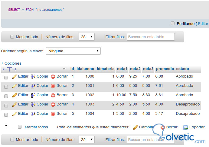 -- -- Estructura de tabla para la tabla `notasexamenes` -- CREATE TABLE `notasexamenes` ( `id` INT(11) NOT NULL AUTO_INCREMENT, `idalumno` INT(11) NOT NULL, `idmateria` INT(11) NOT NULL, `nota1` DECIMAL(10,2) NOT NULL, `nota2` DECIMAL(10,2) NOT NULL, `nota3` DECIMAL(10,2) NOT NULL, `promedio` DECIMAL(10,2) NOT NULL, `estado` VARCHAR(100) NULL DEFAULT NULL, PRIMARY KEY (`id`) ) COLLATE='latin1_swedish_ci' ENGINE=InnoDB -- Indices de la tabla `notasexamenes` -- ALTER TABLE `notasexamenes` ADD PRIMARY KEY (`id`); A continuación añadimos algunos datos a la tabla notasexamenes -- Volcado de datos para la tabla `notasexamenes` INSERT INTO `notasexamenes` (`id`, `idalumno`, `idmateria`, `nota1`, `nota2`, `nota3`, `promedio`, `estado`) VALUES (1, 1000, 1, '8.00', '9.25', '7.00', '0.00', ''), (2, 1001, 1, '6.33', '8.50', '8.00', '0.00', ''), (3, 1002, 1, '10.00', '7.50', '8.33', '0.00', ''), (4, 1003, 2, '4.50', '2.00', '5.50', '0.00', ''), (5, 1004, 1, '3.50', '2.00', '4.00', '0.00', '');