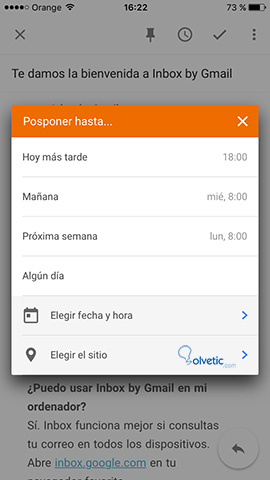 Inbox tiene una función muy interesante que nos permite posponer cualquier correo que recibamos para su posterior revisión. Con esto vamos a poder seleccionar que queremos posponer el correo para “X momento” en el que inbox nos avisará de ello. Para realizar esto, tenemos que entrar dentro del correo seleccionado y seleccionar el reloj que se muestra en la parte derecha superior. Una vez aquí podremos ajustar todos aquellos detalles que consideremos necesarios.