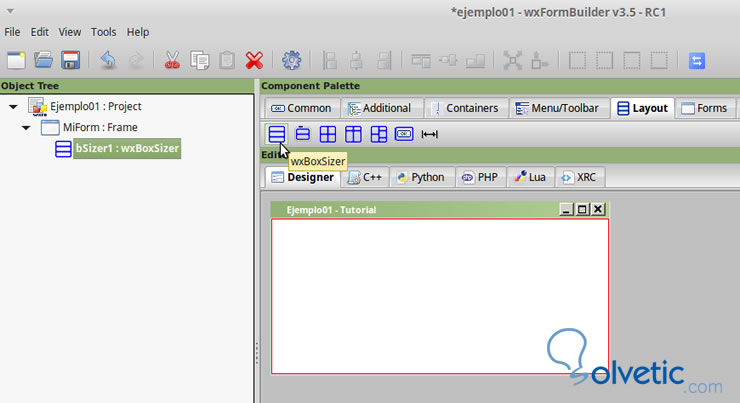 A continuación vamos a wxFormbuilder y comenzaremos a diseñar la pantalla. Los componentes se distribuyen en la pantalla mediante Layout y grillas, en este caso seleccionaremos un wxBoxSizer vertical, lo que hace es dividir la pantalla en tres filas, donde añadiremos los componentes.