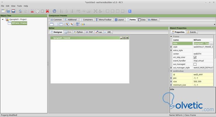 Luego desde las propiedades podremos modificar el nombre del formulario al que le asignamos MiForm y el titulo que será Ejemplo01- Tutorial, ademas podremos modificar muchas opciones como el color de fondo, el tamaño, el tipo de ventana y muchos mas.