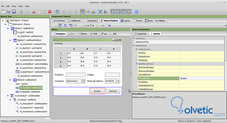 Además de diseñar interfaces gráficas podemos añadir eventos, por ejemplo hacemos clic en el botón grabar y vamos a la pestaña Events, buscamos el tipo de evento, en este caso OnLeftDown, clic del botón izquierdo del mouse presionado.