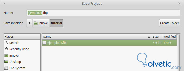 Para generar el código en un archivo, primero deberemos guardar el proyecto desde el menú File > Save As, y lo guardamos como ejemplo01.fbp