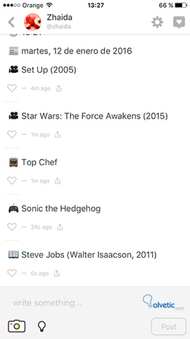 Comparte el titulo de la película que quieras, y aparecerá con el símbolo de una cámara. Puedes hacer lo mismo con un programa de tv, un juego o un libro.