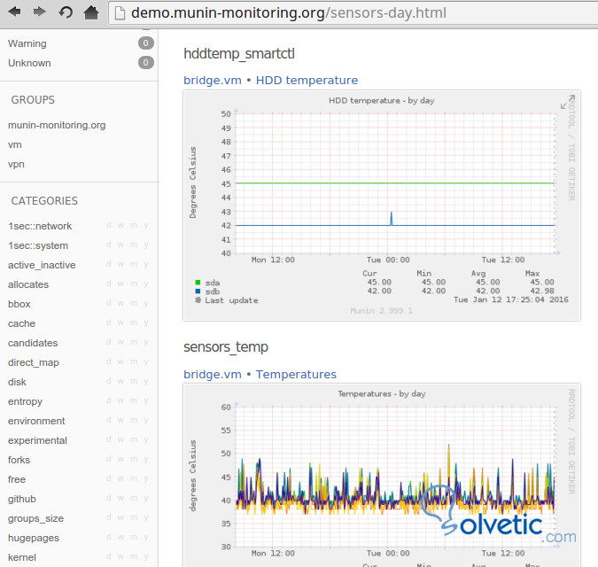 Si lo instalamos deberemos esperar a que recolecte datos, para probar Munin funcionado podemos encontrar muchos servidores demos en Internet, buscando la palabra demos Munin para ver distintos análisis con muchos datos relevados.