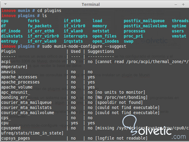sudo munin-node-configure --suggestPara instalar los plugins extras ejecutamos el siguiente código desde una venta de terminal