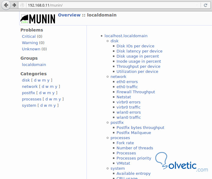 Vemos que aparece nuestro servidor solo configuramos el local, hacemos un clic sobre el nombre del grupo localdomain que es el dominio por defecto, y veremos las diversas estadísticas y métricas que nos brinda Munin, entre ellas consumo de CPU, trafico de la red wifi y ethernet, errores producidos en la red, rendimiento por dispositivos, porcentaje de disco utilizado, rendimiento y utilización de emails, procesos cantidad y prioridades.