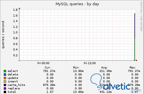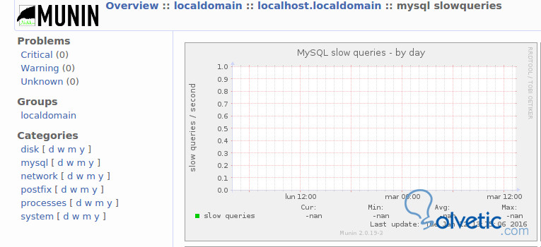 sudo service munin-node restartA continuación podemos ver que se añadió Mysql y miramos un gráfico de consultas lentas, el plugin debe poder acceder y monitorizar MySQL, por eso habilitamos los permisos.