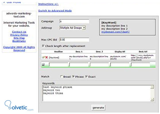 Adwords Generator se trata de una herramienta que permite generar de manera automática las combinaciones de las palabras claves elegidas. A su vez detecta posibles combinaciones que para una persona pueden pasar inadvertidas.