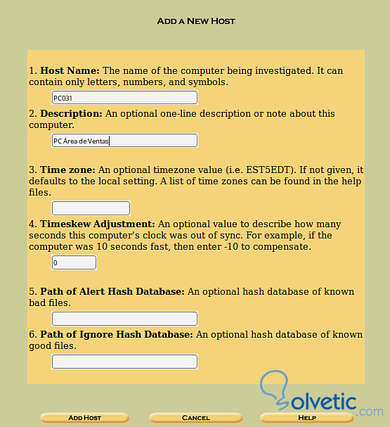 Añadiremos el nombre del host, una descripción, la hora gmt en caso de ser de otro país, podemos añadir el horario de desfase respecto al ordenador también y existen bases de datos que contienen hashes de archivos maliciosos conocidos.