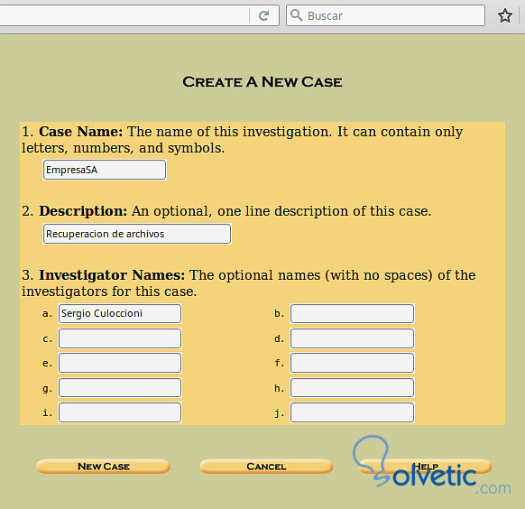 Se nos abrirá la pantalla para crear un caso donde asignaremos el nombre del caso, sin espacios ya que este nombre se convertirá en una carpeta donde se almacenara la información recolectada en la investigación. En este caso el nombre sera EmpresaSA, luego añadimos una descripción del caso, también añadiremos los nombres de los investigadores a cargo del caso, luego hacemos click en New Case.