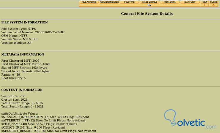 En este caso podemos ver que se trata de una partición NTFS de Windwos XP, y demás datos del tamaño de disco y sectores. Luego podemos ir a File Analysis, para ver la estructura de archivos y directorios.