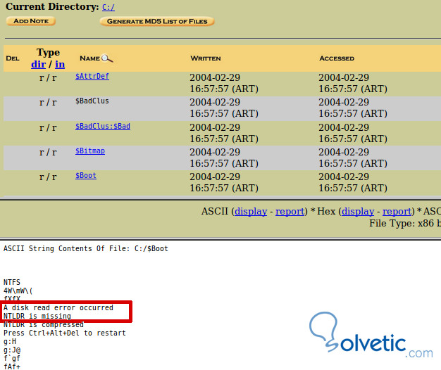 Vemos dentro de los directorios el directorio Boot que contiene los log de booteo de esa partición, si hacemos un click veremos el log y podremos verlo en distintos formatos como ASCII, Hexadecimal y texto, en este caso vemos el siguiente error: