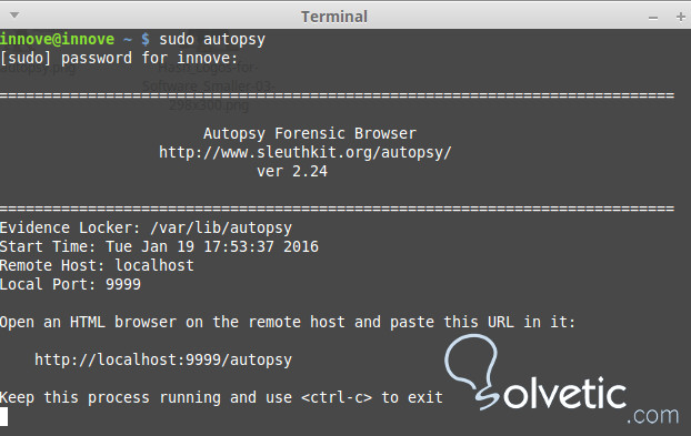 A continuación vamos a cualquier navegador y escribimos la URL http://localhost:9999/autopsy que nos indica Autopsy que funcionará como un servidor mientras lo tengamos ejecutando.