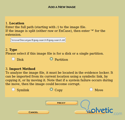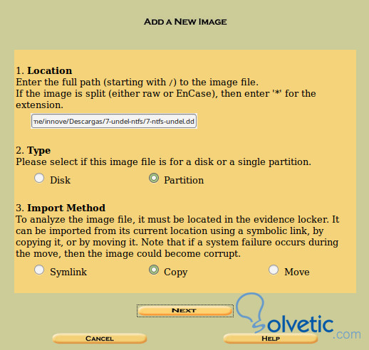 En este caso la utilizamos la imagen creando una copia,si utilizamos el Symlink que es en enlace a donde se encuentra la imagen podemos tener como problema que podríamos dañar la imagen, si la copiamos se hará una copia en el directorio del caso, pero ocuparemos mas lugar, recordemos que los archivos que usamos son demos que ocupan unos 150 Megabytes, una imagen real de un ordenador o un servidor podría ocupar varios Gigabytes.