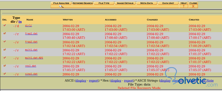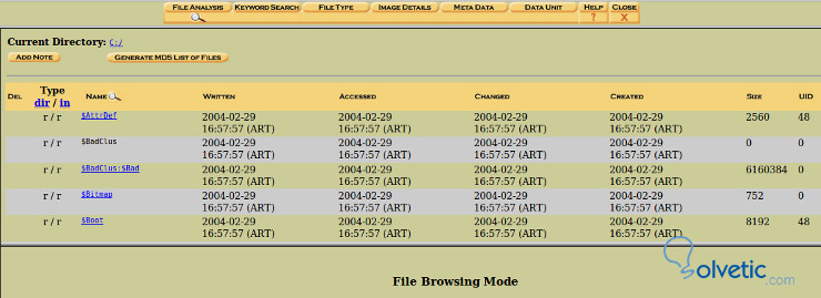 A continuación si hacemos un click en el enlace dir en la columna Type, podremos navegar por los directorios y ver archivos eliminados para tratar de recuperalos.