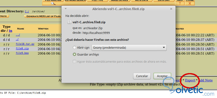 También podemos exportar y descargar archivos para analizarlos o recuperarlos haciendo click en el enlace que queremos descargar, y luego hacemos click en Export