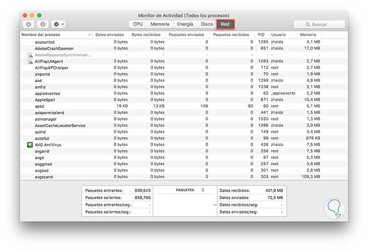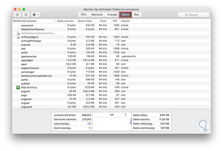 El panel de disco nos va a mostrar la cantidad de datos que envía y recibe Mac a través de la red. Este proceso es muy útil para identificar que procesos están enviando y recibiendo la mayoría de los datos.