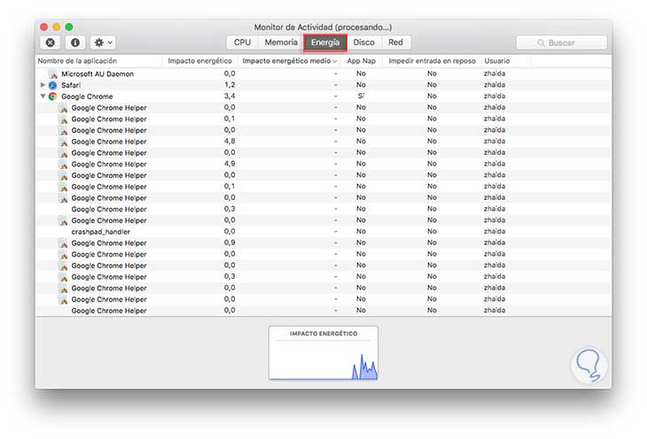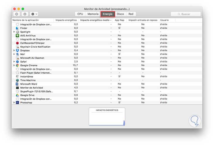 En esta pestaña vamos a poder ver el impacto de la energía en las aplicaciones en ejecución, el impacto promedio de energía de cada una de las aplicaciones en las ultimas ochos horas e incluso si existe alguna aplicación que impida el reposo. Otra de las características que podemos ver en esta pestaña, es cuando las aplicaciones de manera individual se van a “dormir la siesta”(App nap) mientras que están abiertas pero no están en uso.