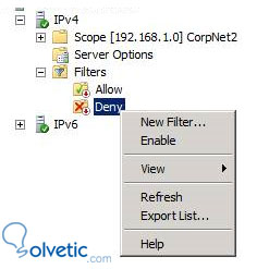 Podemos acceder a esta función abriendo la consola DHCP y navegar hasta la Filters nodo del árbol de IPv4 (tener en cuenta que los filtros no están disponibles para las direcciones IPv6). Tenemos dos opciones al hacer clic en el Permitir o Denegar nodo - Nuevo filtro y Activar. En general, debemos tener la lista de direcciones MAC que desea permitir o denegar, y luego crear las entradas de filtro y, a continuación, habilitar el permitir o denegar opciones. Como se ve en la imagen.