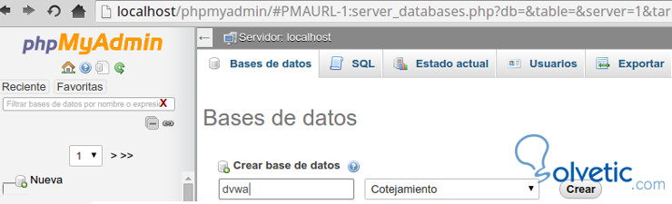 A continuación necesitamos configurar la base de datos para ello iremos desde phpmyadmin.