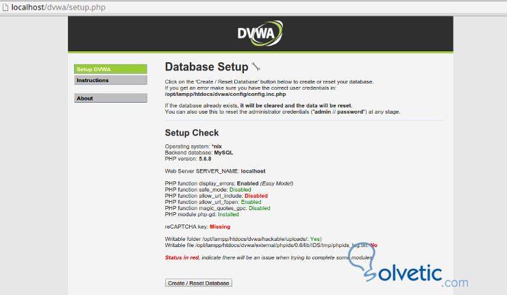 <?php$_DVWA = array();$_DVWA[ 'db_user' ] = 'root';$_DVWA[ 'db_password' ] = '';$_DVWA[ 'db_database' ] = 'dvwa';$_DVWA[ 'db_server' ] = 'localhost';?>Guardamos la configuración y deberemos ir al navegador donde tenemos la web y hacemos clic en Create/Reset Database para continuar con la instalación.