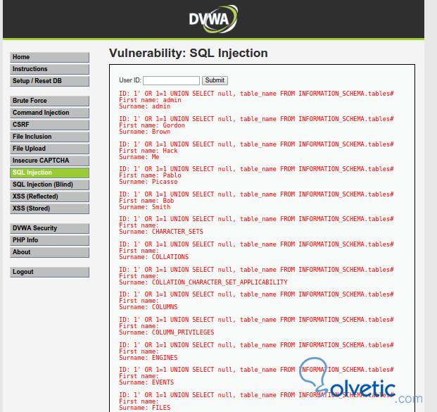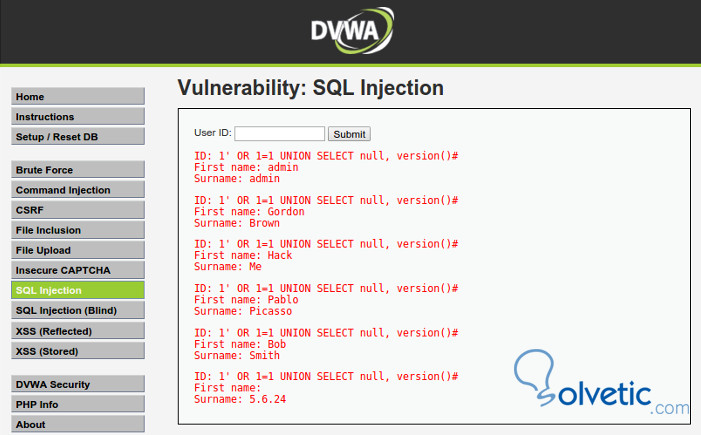 La sentencia SQL ejecuta directamente lo que llega sin controles o verificación alguna. Así que esto hace que el código sea vulnerable a inyecciones SQL, por ejemplo podemos obtener el listado completo de usuarios si en la pagina de inyección SQL en lugar de un id añadimos el siguiente código: