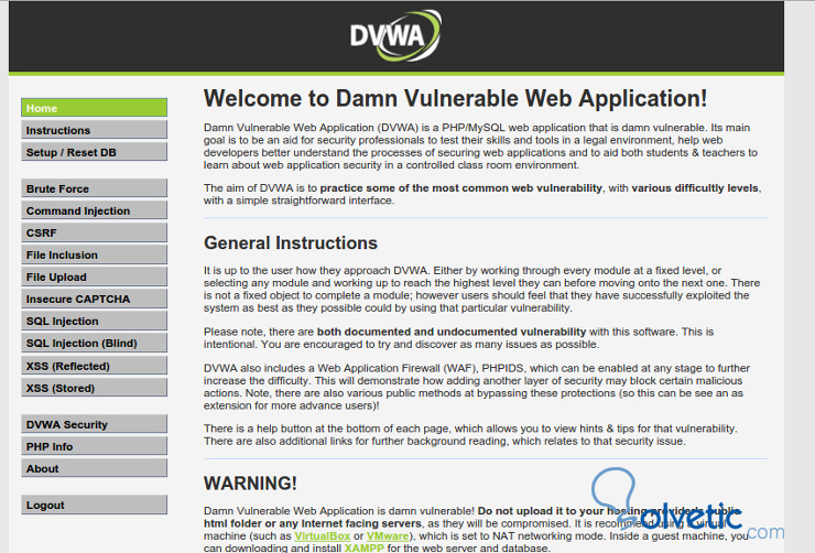 Utilizaremos Damn Vulnerabilty Web Aplication (DVWA), es un sitio web para instalar en cualquier servidor que tengamos, inclusive uno local para poder hacer pruebas de pentesting. Podemos descargarlo desde su pagina oficial.