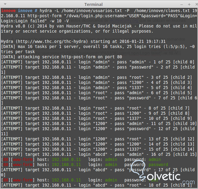 Por lo tanto podemos crear un script que pruebe distintas combinaciones para usuario y clave o utilizar un programa como xHydra que es una interfaz gráfica para Hydra o directamente desde la linea de comando si ese es el único acceso que tenemos via SSH al servidor.