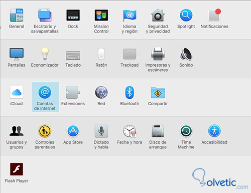 Lo primero que tenemos que hacer es irnos a las preferencias del sistema. Dentro de las preferencias, debemos seleccionar “cuentas de internet”.