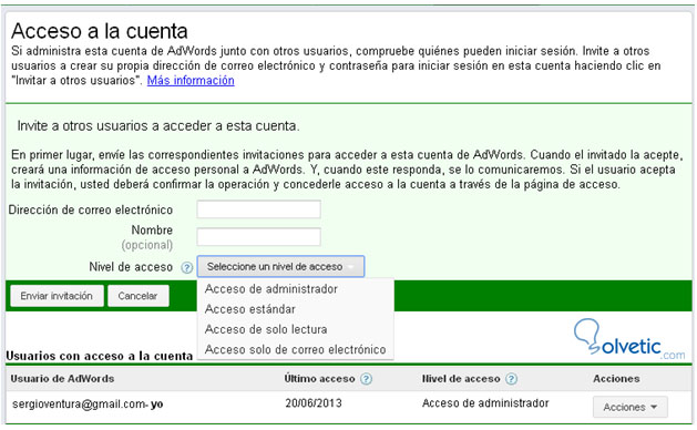 Se debe aclarar que los usuarios a los que se le otorgue algún permiso de acceso deben poseer una cuenta en Google y no pueden acceder a otra cuenta de Google Adwords. En el caso de tener acceso a otra cuenta de Adwords se deberá crear una cuenta de Google que no está vinculada a la misma.