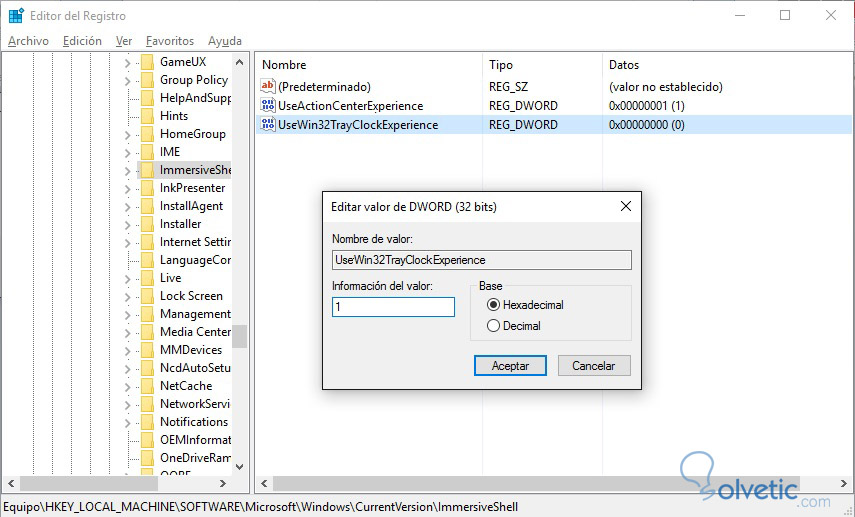 Pulsamos doble clic encima de este valor que hemos creado y veremos que el velor hexadecimal es 0, hay que cambiarlo a 1 si queremos que se haga efecto el cambio y volveréis a tener el reloj antiguo que algunos tanto echáis de menos.