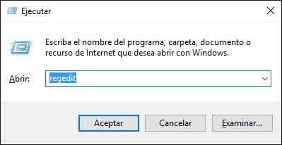 Aparecerá la ventana de ejecución, escribimos Regedit y pulsamos Aceptar.