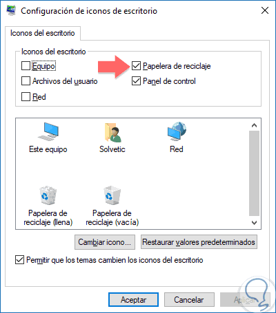 Como vemos aparecen todos los iconos de escritorio de Windows 10 que podéis habilitar o deshabilitar simplemente dejando marcadas las que os interese que aparezca. En este caso hemos desmarcado la opción “Papelera de Reciclaje” para que no continúe apareciendo en el escritorio.
