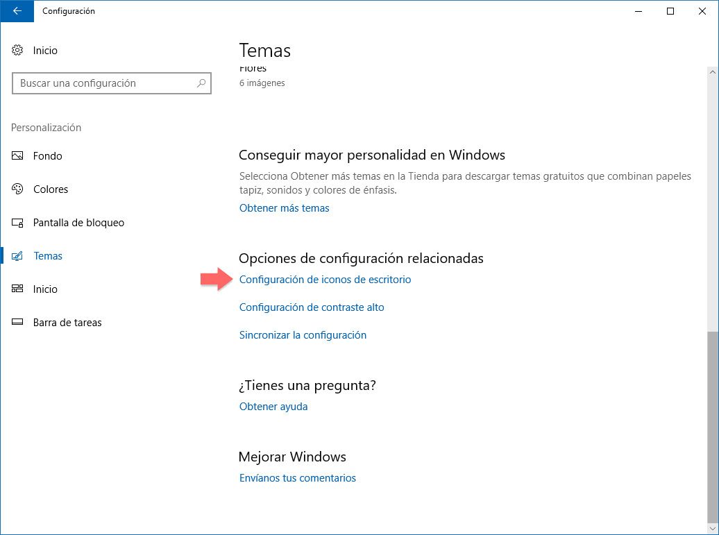 Pulsamos en el menú de la izquierda la opción “Temas”, y nos aparecerá la opción “Configuración de iconos de escritorio”, entra en ella.