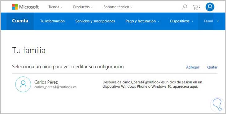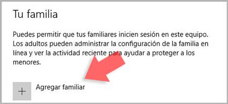 Una vez ya tenemos nuestra cuenta de Microsoft asociada, vamos a crear la cuenta para un niño. Para ello en Tu familia, selecciona “Agregar familiar”