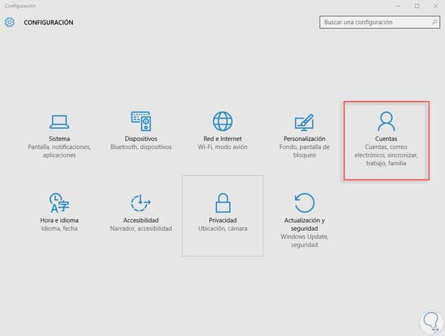 Lo primero que haremos será irnos al botón de menú de “Inicio” y después en “Configuración”. Seleccionaremos el icono de “Cuentas” para modificarlas.