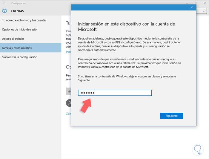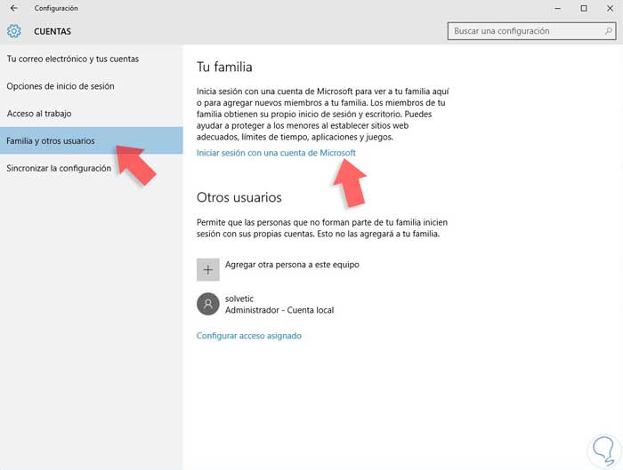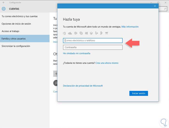En la parte del menú de la izquierda seleccionaremos “Familia y otros usuarios”. Te pedirá que inicies sesión con una cuenta de Microsoft para poder tener privilegios de administrador.