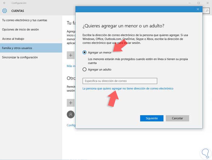 Seleccionamos “Agregar menor”. Nos solicita una cuenta de correo pero en caso de no tenerla podremos omitirlo en la opción de la persona que quiero agregar no tiene correo electrónico”