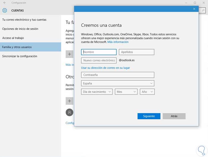 Si hemos seleccionado que el menor que agregamos no tiene cuenta de correo electrónico, tendremos que crearle una cuenta nueva.