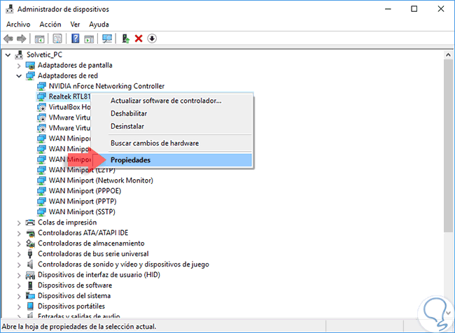Accedemos nuevamente al Administrador de dispositivos y allí damos clic derecho sobre el adaptador de red y seleccionamos la opción "Propiedades".