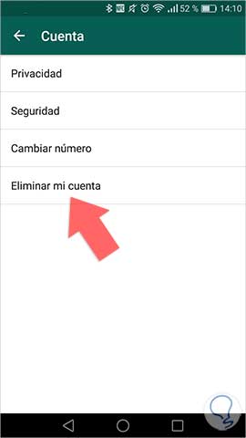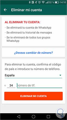 A continuación debemos introducir nuestro número de telefono y seleccionar que queremos “Eliminar mi cuenta”. Si lo único que queremos es cambiar de teléfono nuestra cuenta de Whatsapp sin tener que eliminarla también podemos hacerlo.
