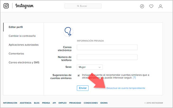 Una vez que hemos entrado en la web y nos hemos logado, tenemos que seleccionar el icono de “Editar perfil”. Una vez dentro de nuestro perfil, tenemos que dirigirnos a la esquina inferior derecha y seleccionar “Desactivar mi perfil temporalmente”