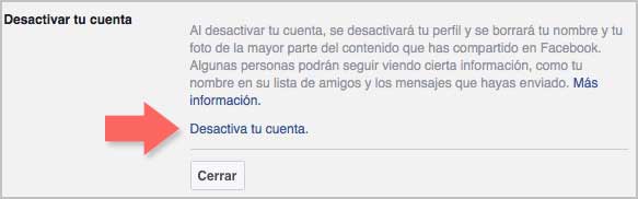 Una vez que hayamos seleccionado esto, nos aparecerá una ventana emergente en la que se nos informará de las condiciones y de las posibilidades que ofrece antes de que desactivemos nuestra cuenta por completo. Si estamos seguros de querer borrarla, debemos seleccionar “Desactivar”
