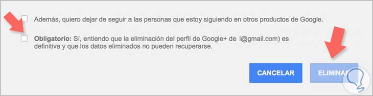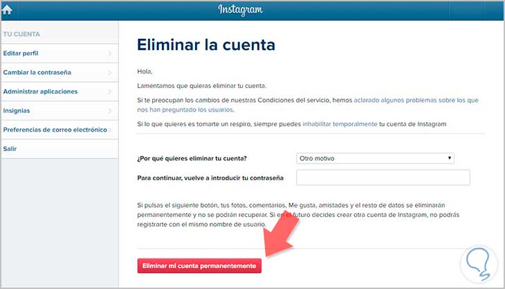 Una vez que estemos de acuerdos con todas las condiciones que nos ha expuesto, debemos señalar en la parte inferior lo que supone la eliminación de nuestra cuenta y señalar “Eliminar”