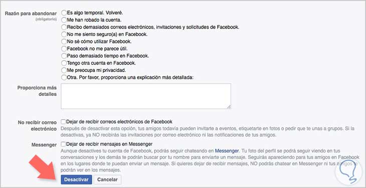 Una vez en este apartado debemos seleccionar el motivo por el cual queremos desactivar nuestra cuenta de Facebook. Otra de las cosas que debemos revisar es si queremos también desactivar la opción de “Dejar de recibir correos”. En el caso de no seleccionarla seguiremos recibiendo solicitudes e invitaciones de nuestros amigos en el correo electrónico.