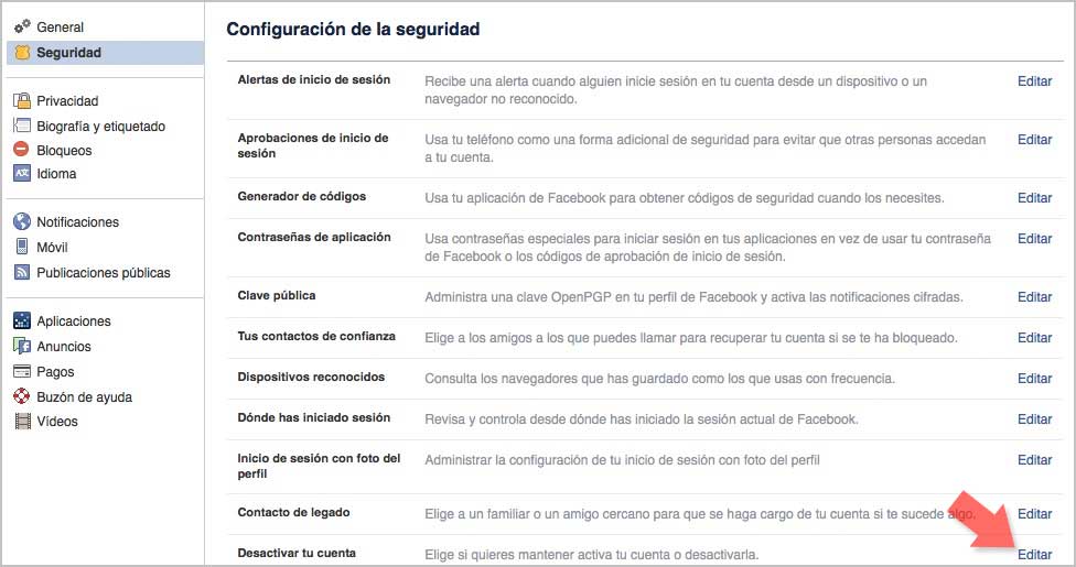 Lo siguiente que debemos hacer es situarnos en la categoría de “Seguridad” – “Desactivar tu cuenta” Una vez que nos encontremos aquí, tenemos que seleccionar “Editar” – “Desactiva tu cuenta”