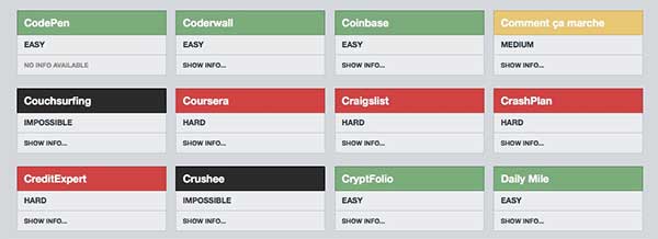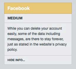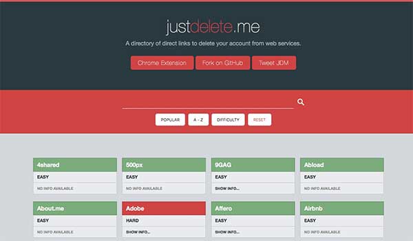 Como podemos observar, en esta página podemos encontrar además de redes sociales, muchas de las web en las que tenemos cuentas abiertas ordenadas por orden alfabético. Los colores indican la dificultad que supone borrarse de ella (verde – sencillo, amarillo – medio, rojo – difícil, negro – imposible)